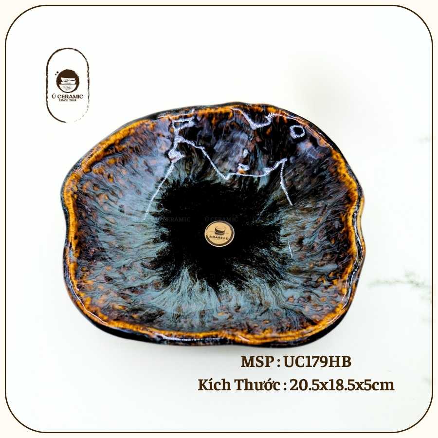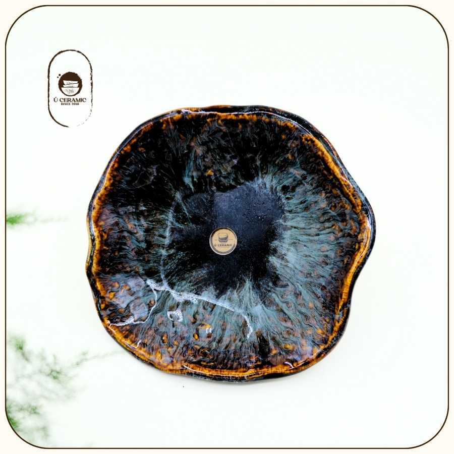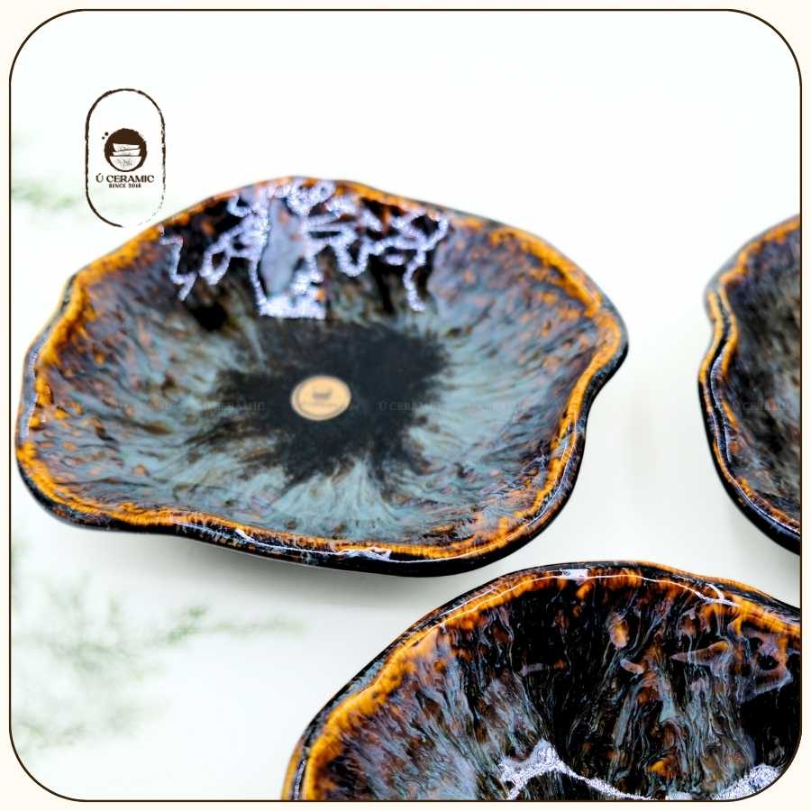 Men Hỏa Biến – Vẻ đẹp được vẽ bởi ngọn lửa. Vân men biến đổi ngẫu nhiên tùy theo nhiệt độ lò nên mỗi sản phẩm là độc bản. Do đặc tính co ngót của đất khi nung nhiệt độ cao, kích thước có thể chênh lệch nhẹ (0.5-1cm), giữ nguyên nét mộc mạc tự nhiên của gốm.